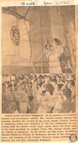 "FIRST LADY UNVEILS MARKER: In the presence of prominent Catholic and government officials, Mrs. Aurora Aragon Quezon last Saturday unveiled the marker of the newly rebuilt Catholic Church in Pandacan, which was destroyed by the last earthquake, in connection with the district fiesta. Upper photo shows the First Lady of the Land unveiling the marker; below, Mrs. Quezon shortly after her arrival in Pandacan. In the picture are His Grace, Archbishop Michael O’Doherty , Eulogio B. Rodriguez, director of the national library; and members of the Catholic Women’s LEague including Miss Manuela Gay and Mrs. Concepcion Rodriguez."